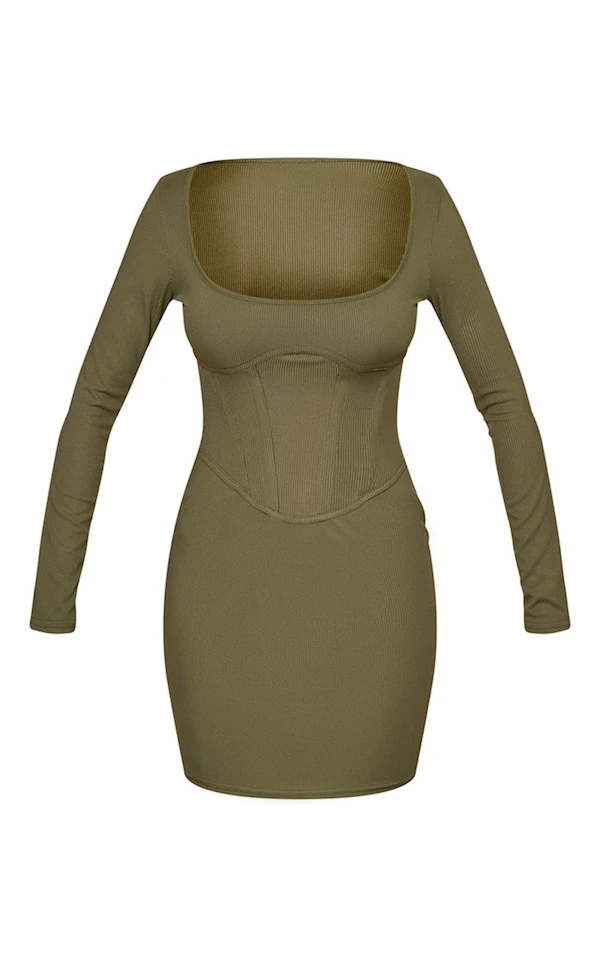 Mini robe corset moulante côtelée kaki à coutures et col carré