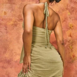 Robe Bustier Moulante En Effet Lin Vert Sauge à Bordures Frangées Et Liserés Structurants