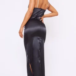 Robe Mi-longue Satinée Noire Découpée à La Taille à Bretelles