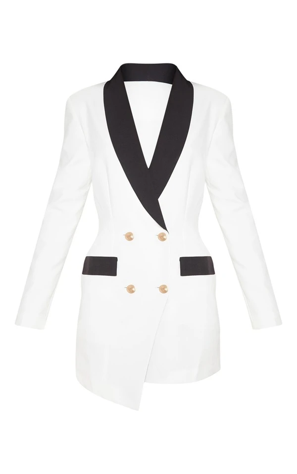 Allo les boss babes ? On vous voit débarquer dans cette robe à la coupe blazer, au coloris blanc, aux parties noires contrastantes et aux boutons dorés très shiny. On la porte avec un mini-sac et des bottines. Pas besoin de plus !