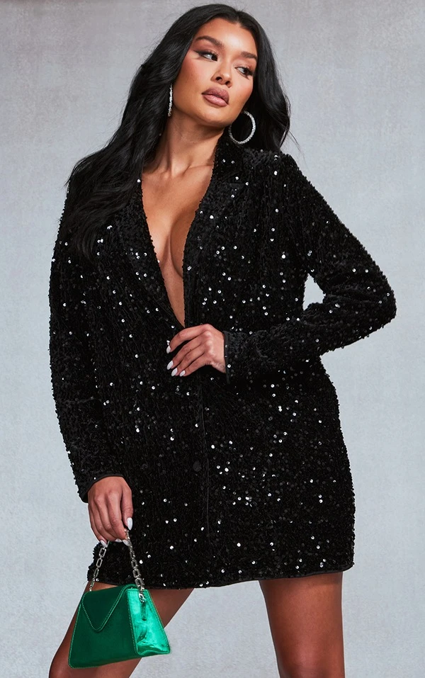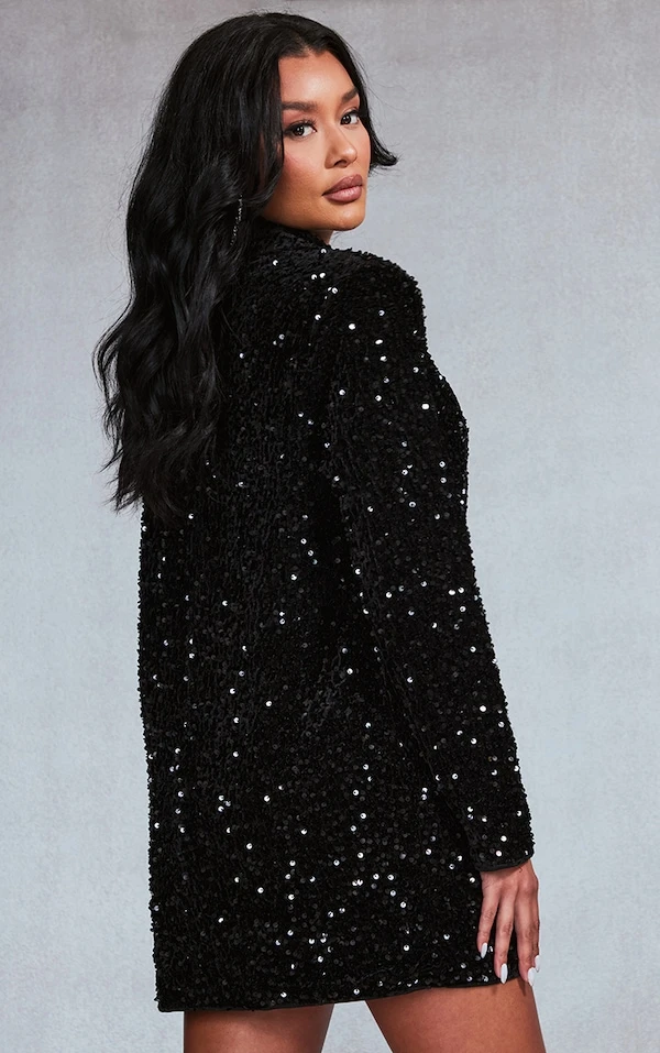 Coup de coeur sur cette robe ! Avec sa coupe blazer, sa couleur noire et ses sequins, elle fait un sans-faute. Elle se porte avec une paire de talons pour faire sensation pendant la saison des fêtes. Gorgeous !