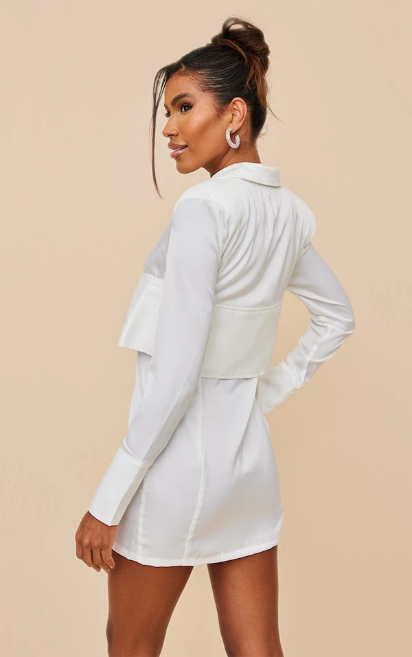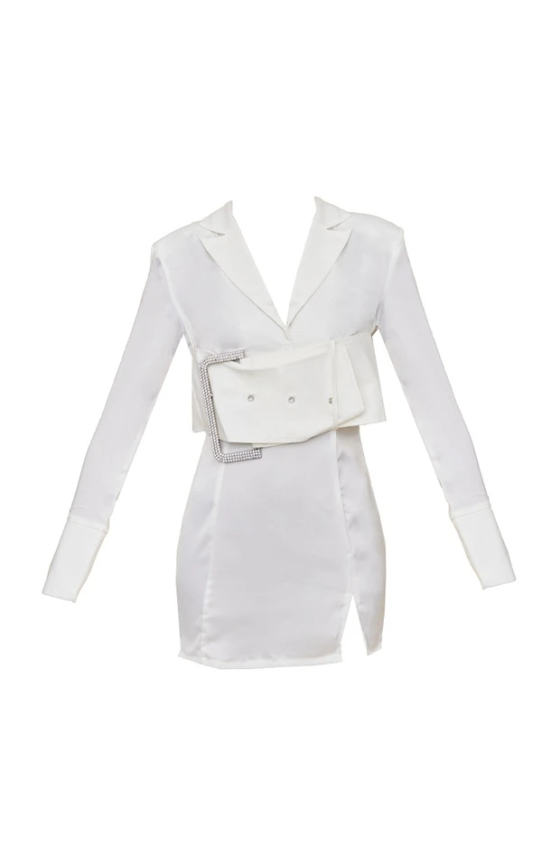 Divine dans cette robe blazer. Avec sa matière satinée de couleur blanche et le détail de sa boucle, on l’adore et elle a tout pour plaire. Portez-la avec une paire de sandales lacées et quelques accessoires strassés. Pour vous démarquer en soirée, cette robe est parfaite !