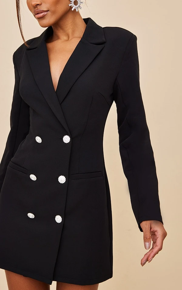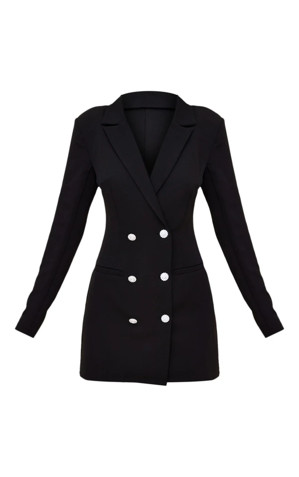 Robe blazer tissée noire à double boutonnière et boutons strassés