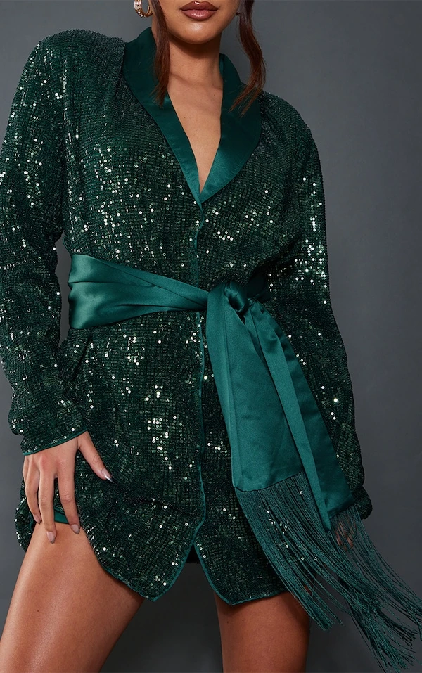 Robe blazer vert émeraude à sequins et détail frange