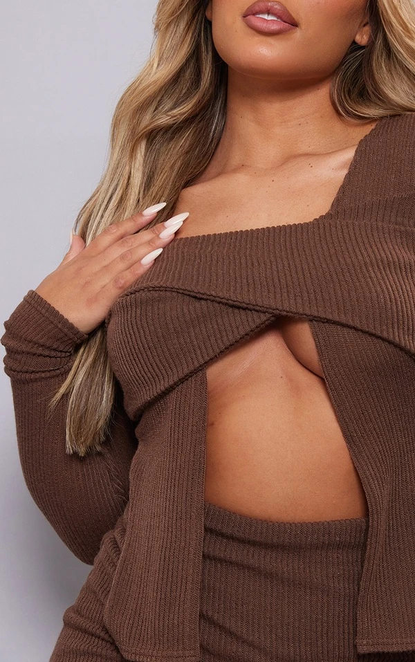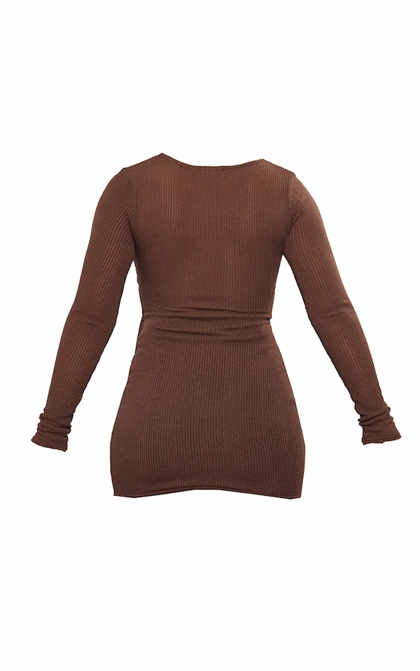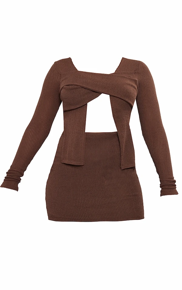 Robe Cache-coeur Moulante Côtelée Chocolat à Découpes