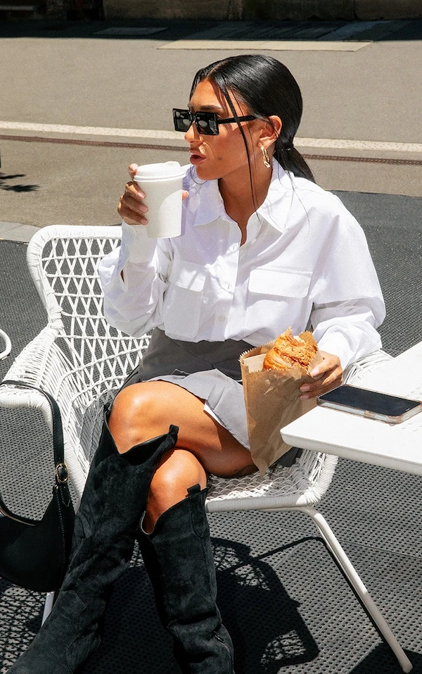 Tellement cool la robe chemise ! Avec son blanc minimal, ses poches et ses manches longues, elle nous a fait craquer. Il ne manque qu’une paire de bottes !