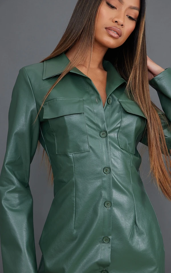 Robe chemise en similicuir kaki à boutons