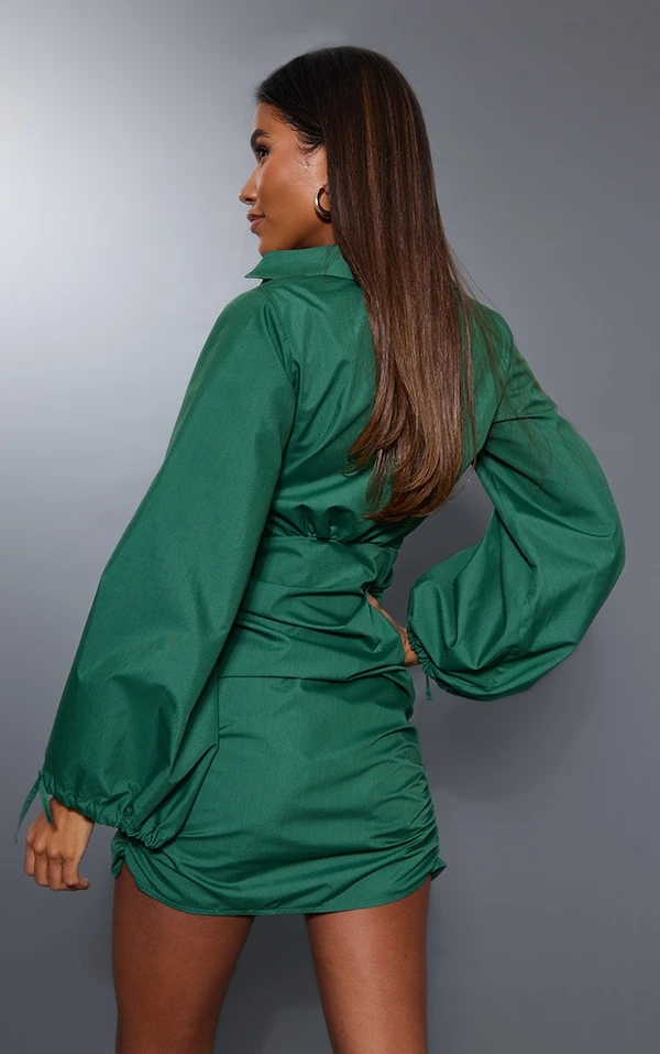 Robe chemise moulante décolletée vert forêt froncée à manchettes nouées