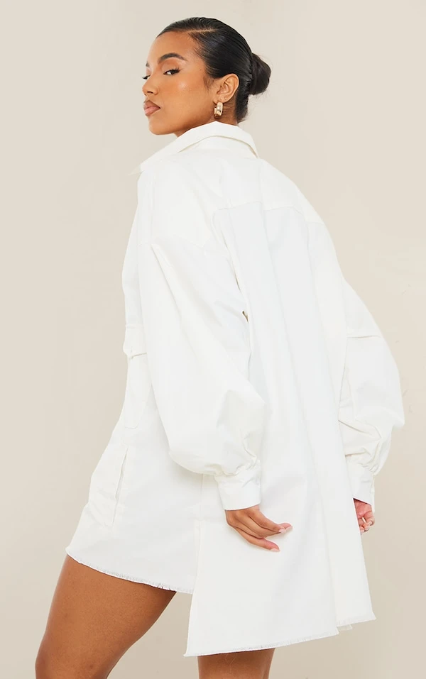 Robe chemise oversize en maille sergée blanche à ourlet élimé et boutons
