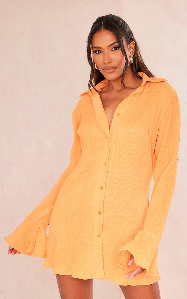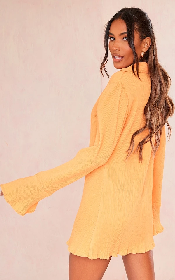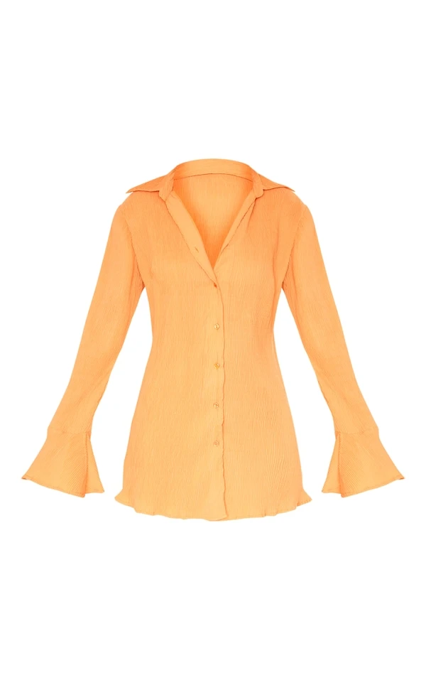Robe Chemise Plissée Mandarine à Manches Flare