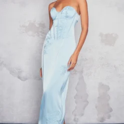 Robe corset mi-longue bleu-gris satinée à fleurs brodées