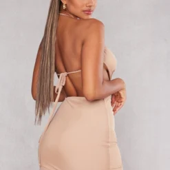 En amour avec cette robe-corset à la coupe moulante. On aime sa matière en bandage, la douceur de sa couleur crème et son design à bretelles croisées et