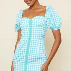 Robe corset moulante vert menthe imprimé vichy à manches bouffantes