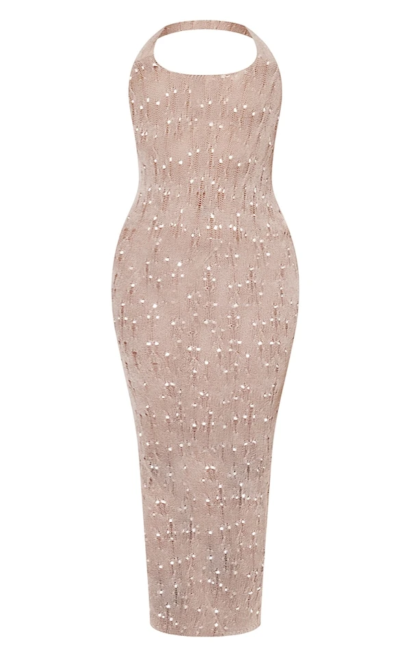 Robe de plage longue crème en maille tricot côtelée déchirée
