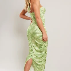Robe droite satinée kaki à col bénitier et épaules dénudées