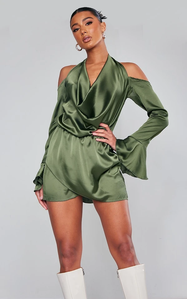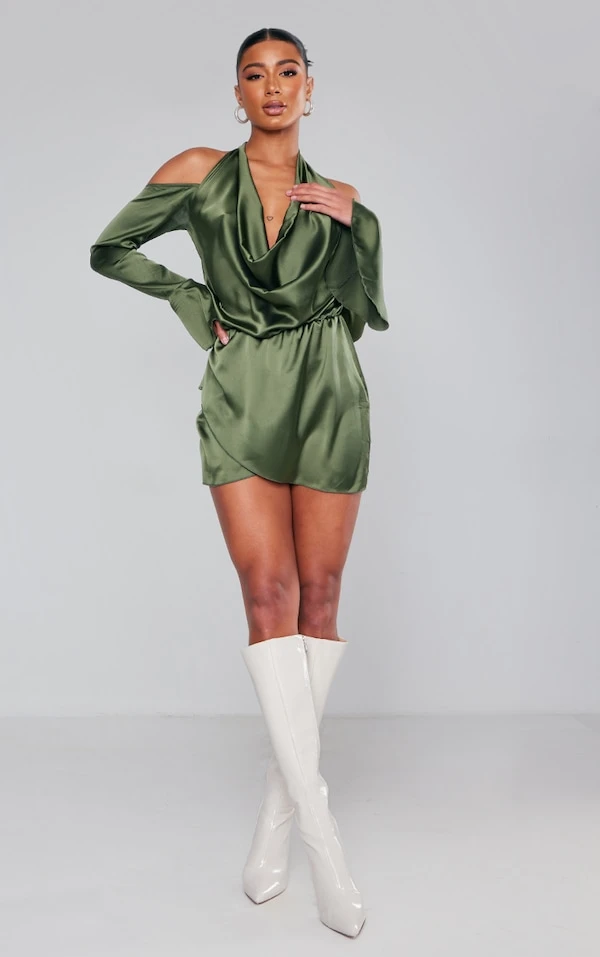 Divine, cette robe à la coupe droite. Avec la couleur kaki de sa matière satinée et son design à col bénitier et à épaules dénudées, on l’adore. Pour un look sans faille, il ne manque qu’une paire de bottes, un blazer ajusté et quelques accessoires. Love it !