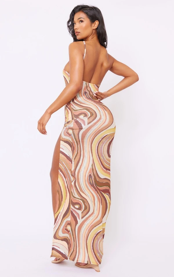 Robe longue asymétrique en mesh dévoré marron imprimé tourbillons
