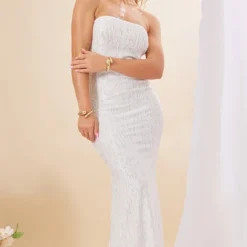 Sublime dans cette robe bustier ! On adore sa couleur blanche, son effet métallisé et son dos bénitier. Faites sensation en la portant avec une paire de talons et quelques accessoires. La prochaine soirée s’annonce stylée !