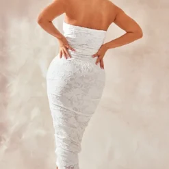 Robe longue bustier texturée blanche métallisée à dos bénitier