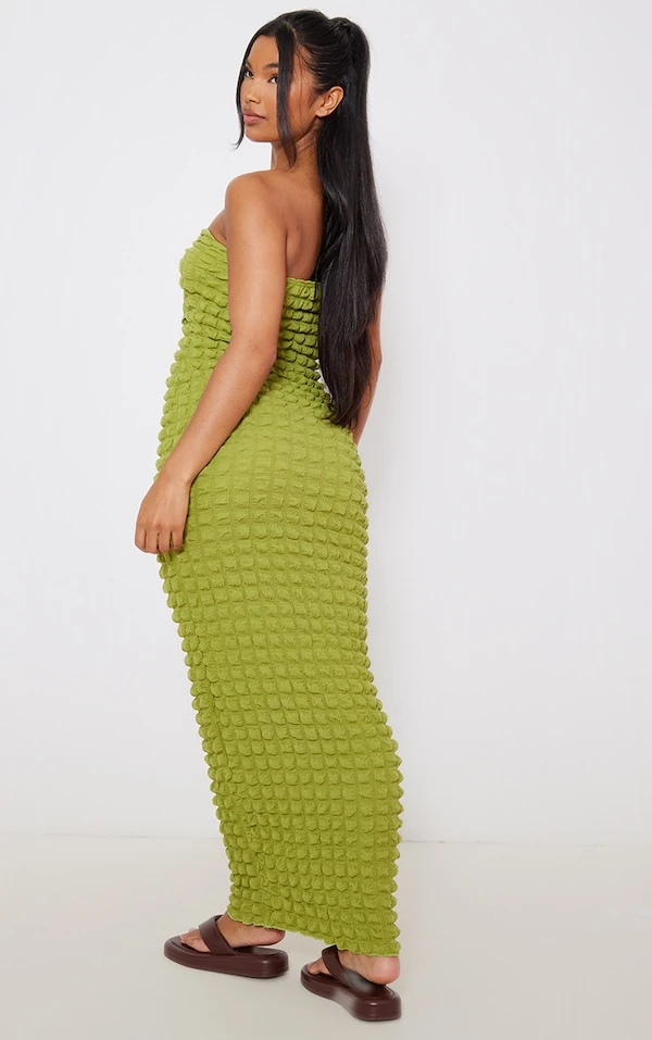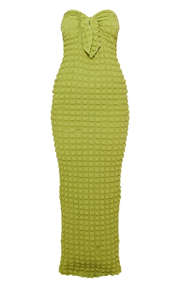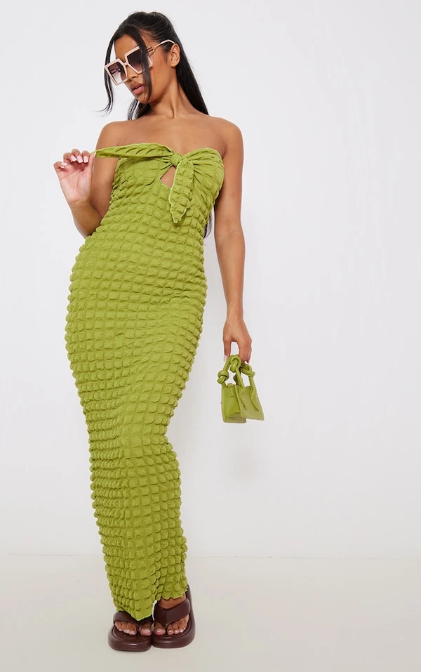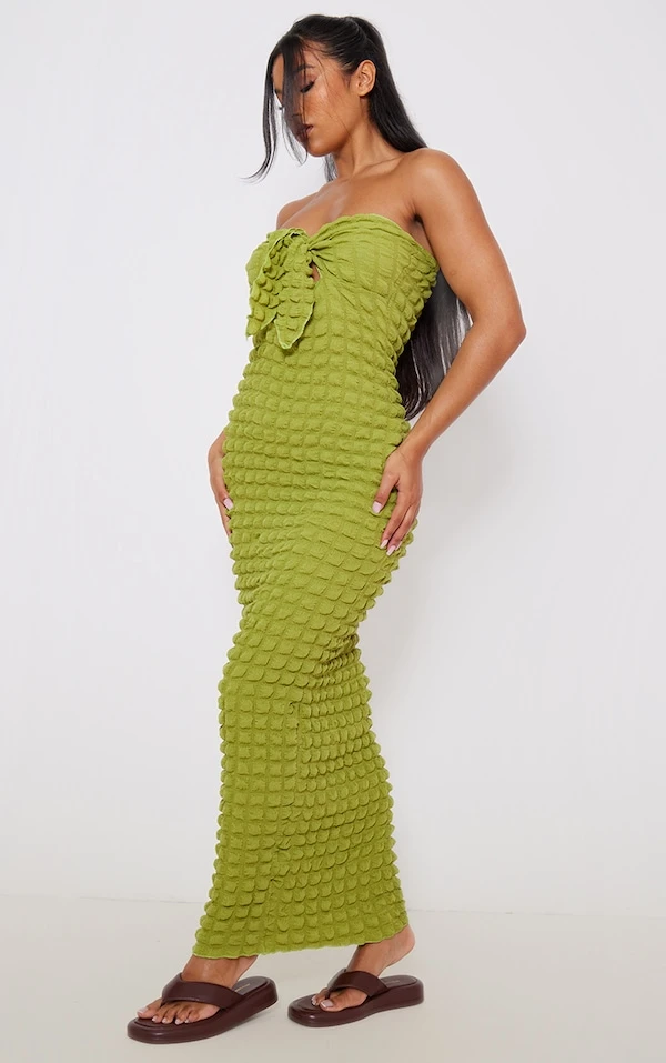 Robe longue bustier texturée vert olive nouée sur le devant