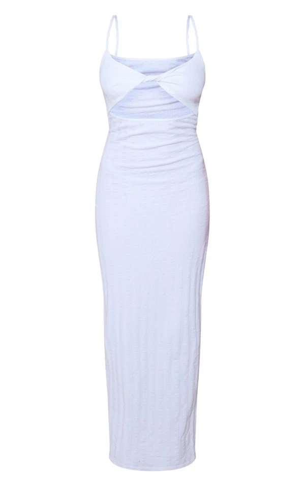Cette robe à la coupe longue est un gros coup de coeur ! Avec sa couleur blanche lumineuse, sa matière côtelée et son design à découpe, on l’imagine déjà sur vous. Portez-la avec des sandales compensées et une pochette pour finir le look. Trop belle !