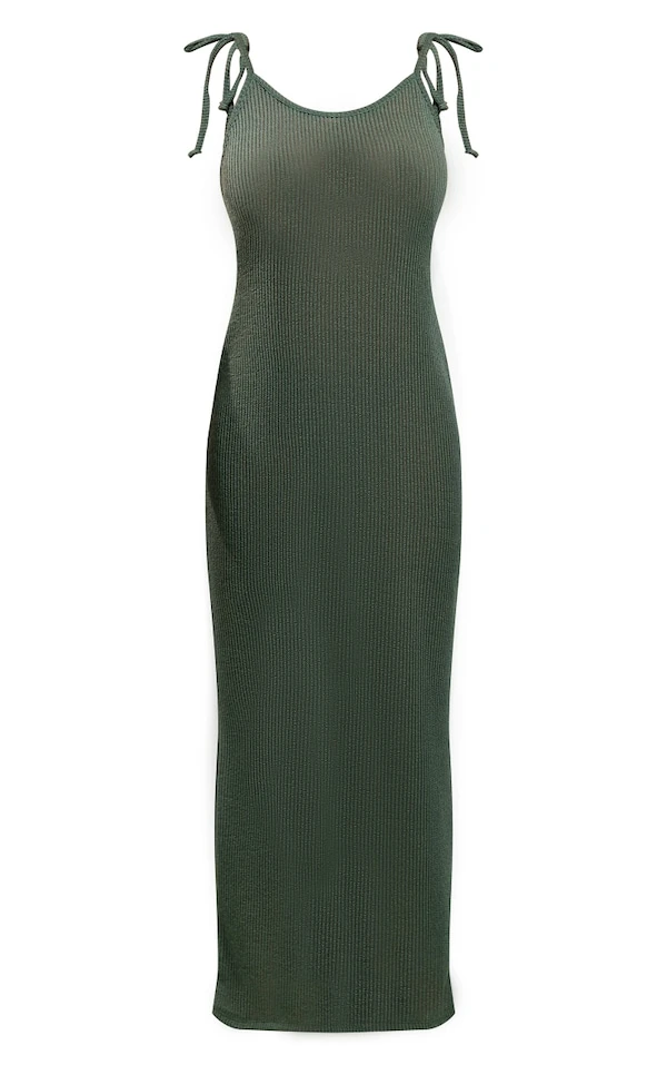 Robe longue côtelée texturée vert forêt à bretelles nouées