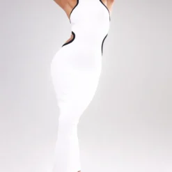 Robe longue découpée en maille côtelée blanche à contours et liserés contrastants