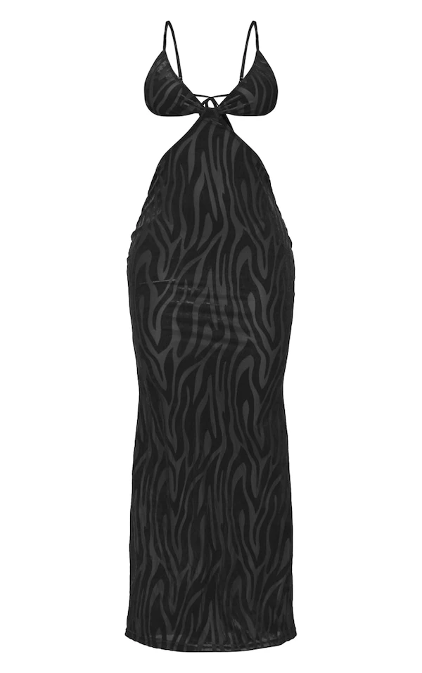 Robe longue découpée noire à zébrures dévorées et bretelles