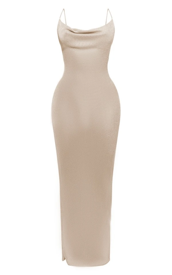 Robe longue dorée métallisée à coutures avec col bénitier et bretelles