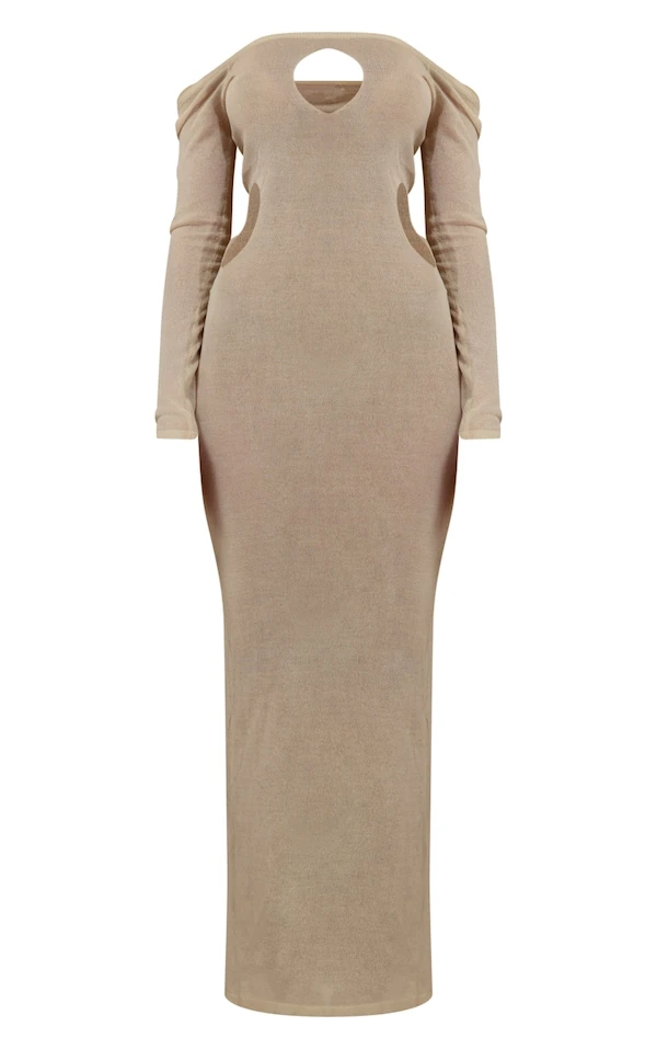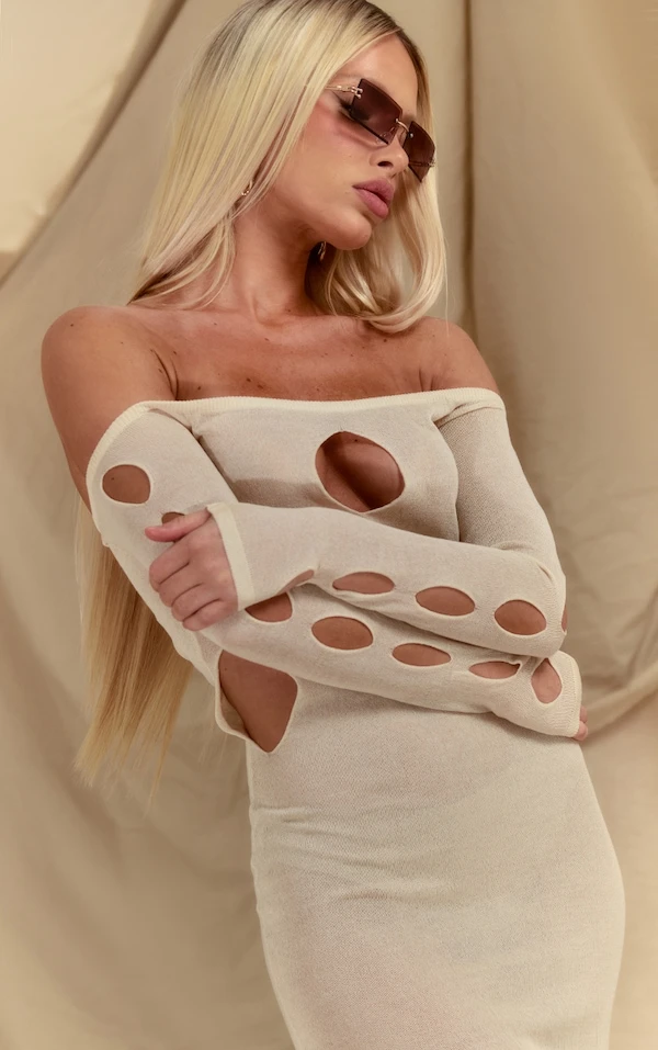 Robe longue en maille transparente crème découpée à manches longues