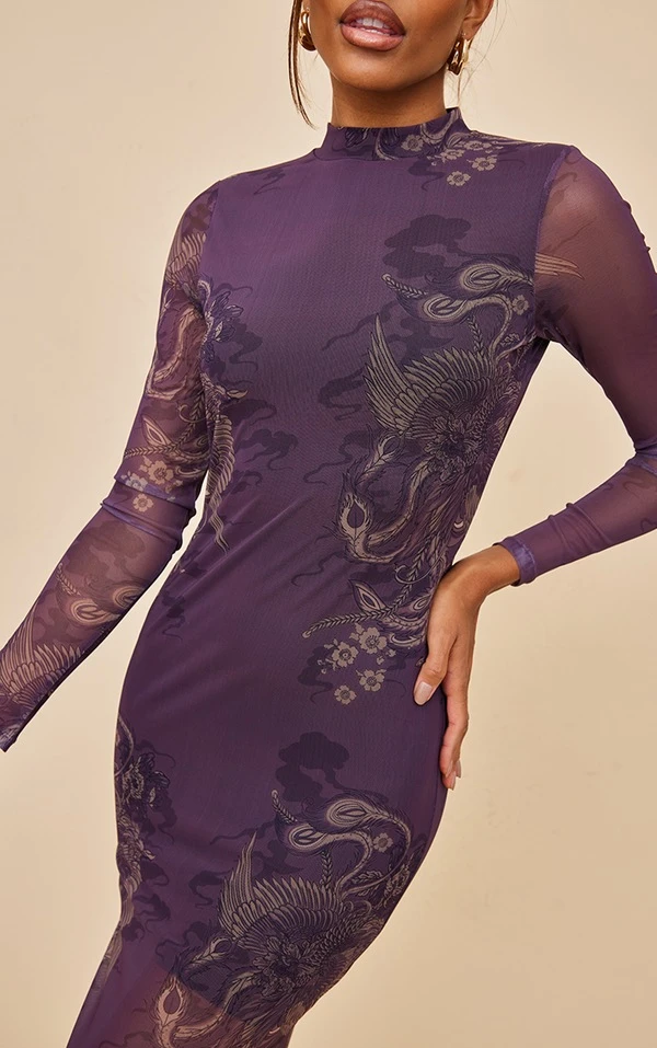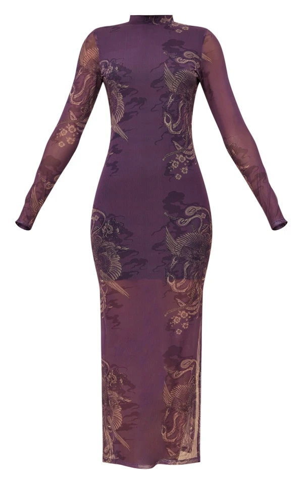 Robe longue en mesh prune imprimé abstrait à manches longues
