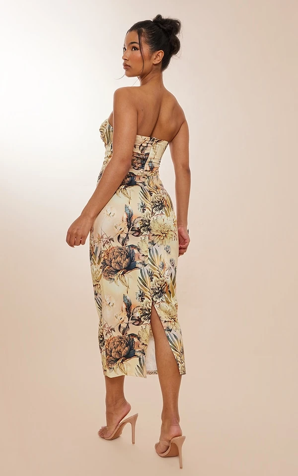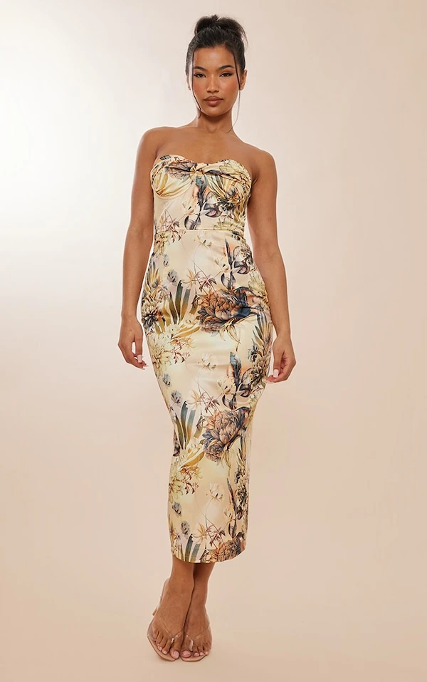 Robe longue satinée beige fleurie à détail bonnets torsadés