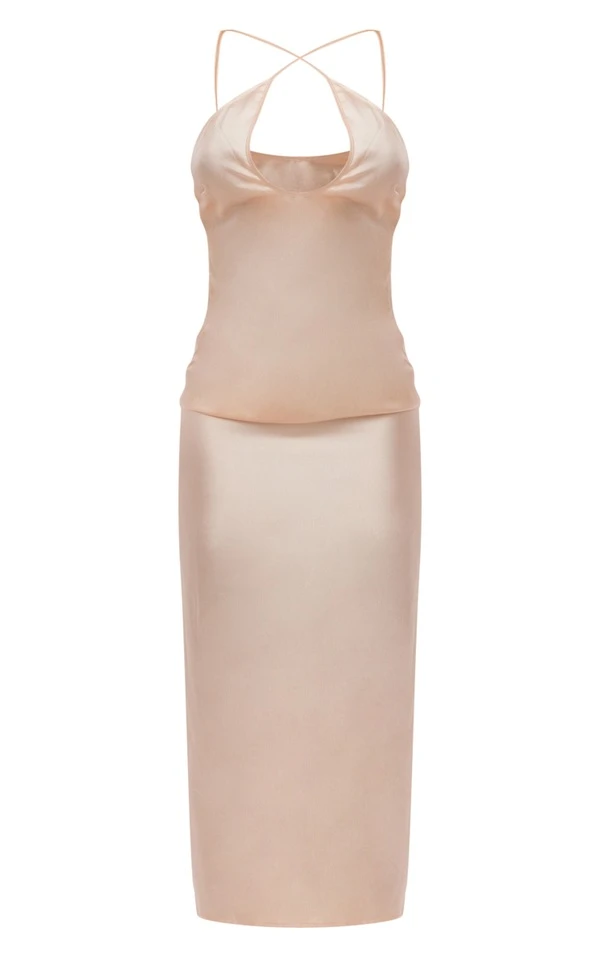 Robe longue satinée nude à bretelles croisées et découpes