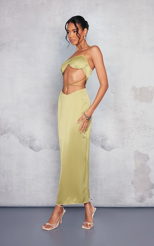 Robe longue satinée vert olive à découpes et bretelles