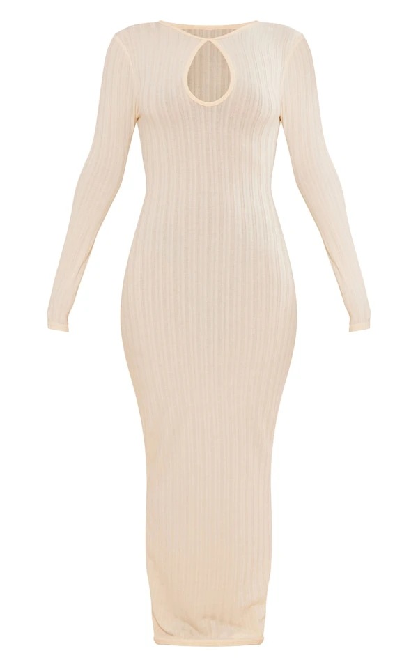 Robe longue très côtelée écrue à découpe goutte d’eau et manches longues