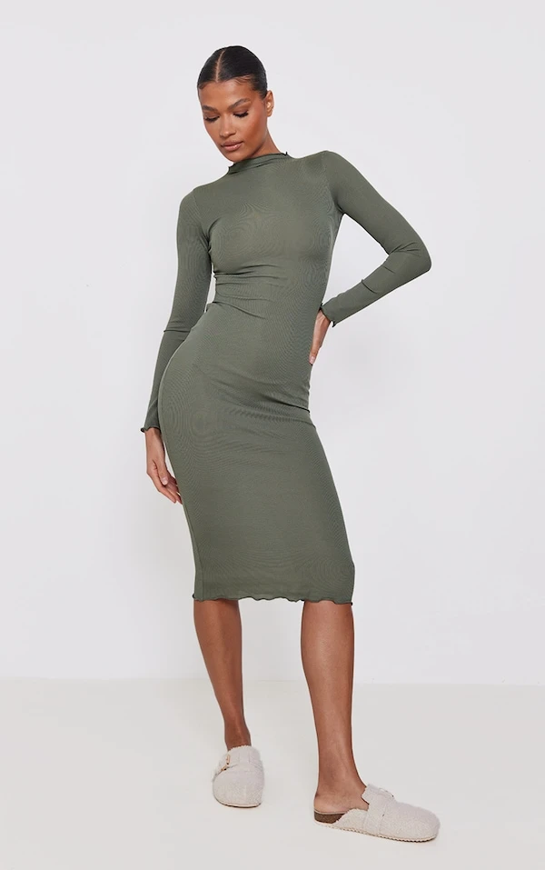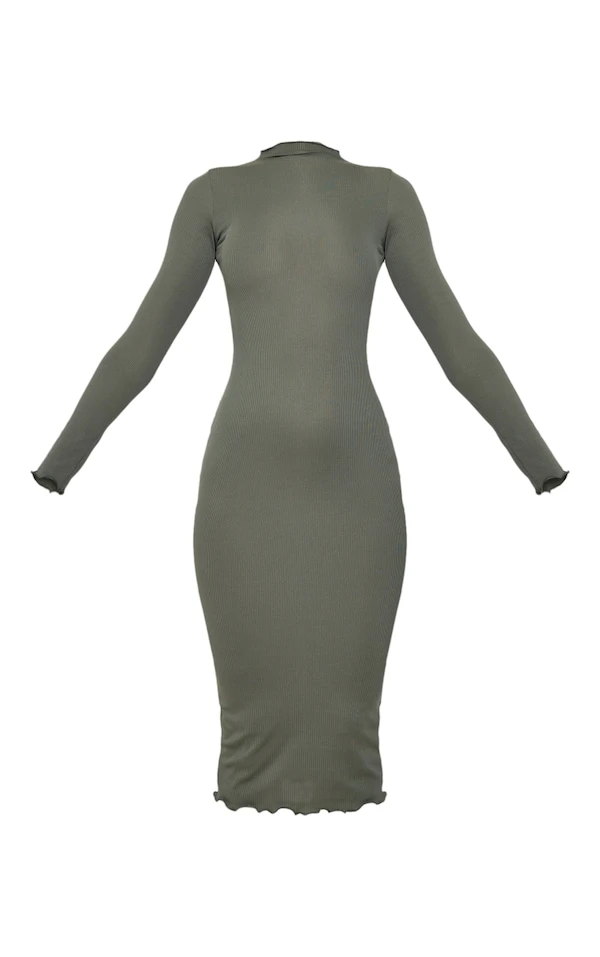 Robe mi-longue côtelée kaki à manches longues et ourlet légèrement volanté