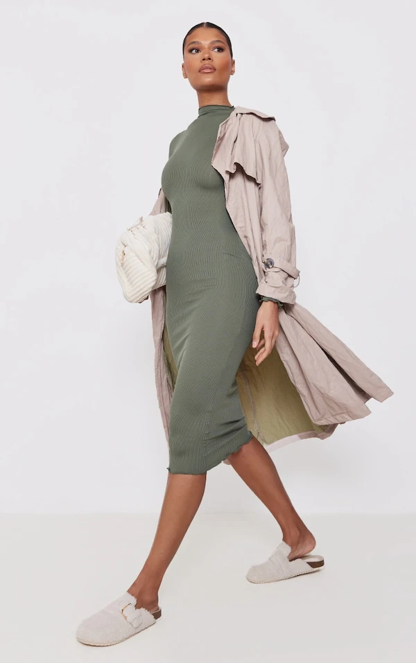 Un classique de garde-robe cette robe ! On adore tellement sa matière côtelée kaki et son design à ourlet légèrement volanté très cool. On la porte avec des baskets et un trench long pour rejoindre les copines en ville. La reine du style, vous !
