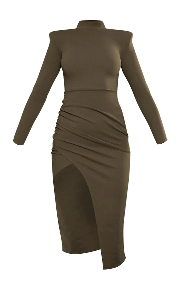 Robe mi-longue crêpée kaki à col montant et manches fendues