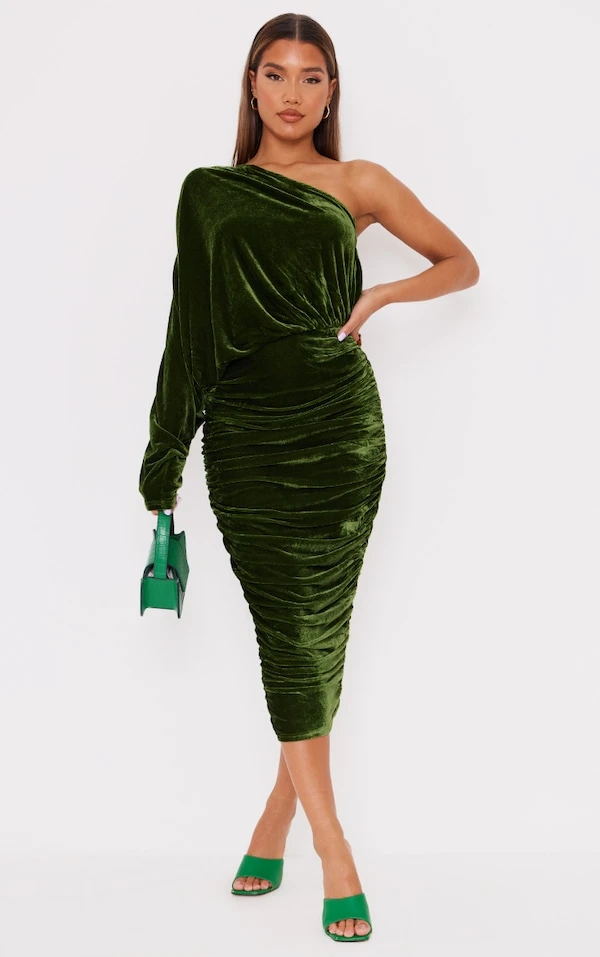 Totalement fans de cette robe à la coupe mi-longue en velours de couleur vert olive super élégante. Avec sa manche unique et son effet froncé, il ne manque qu’une paire de sandales et quelques accessoires. Love it !
