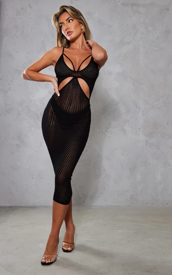 Cette robe est juste must-have ! Avec sa couleur noire, sa transparence, sa maille pointelle et ses parties tricotées présentant différents designs, elle est parfaite pour les babes qui aiment jouer sur les matières. On vous conseille de porter ce genre de robe avec des mules à talon piédestal transparentes. Un coup de coeur absolu !
