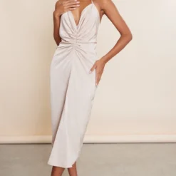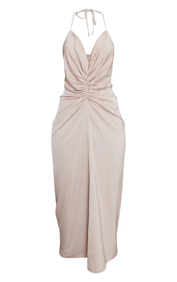 Robe mi-longue satinée champagne froncée sur la taille à dos nu et décolleté plongeant