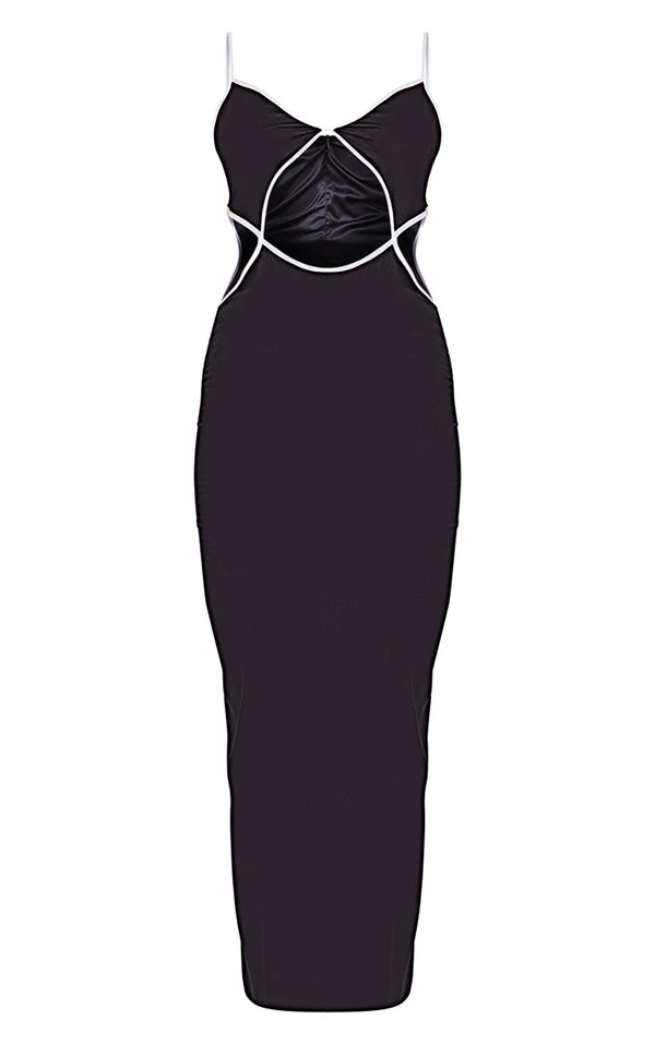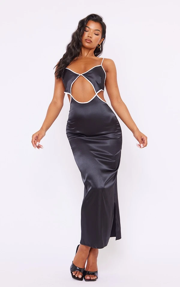 Robe mi-longue satinée noire découpée à la taille à bretelles
