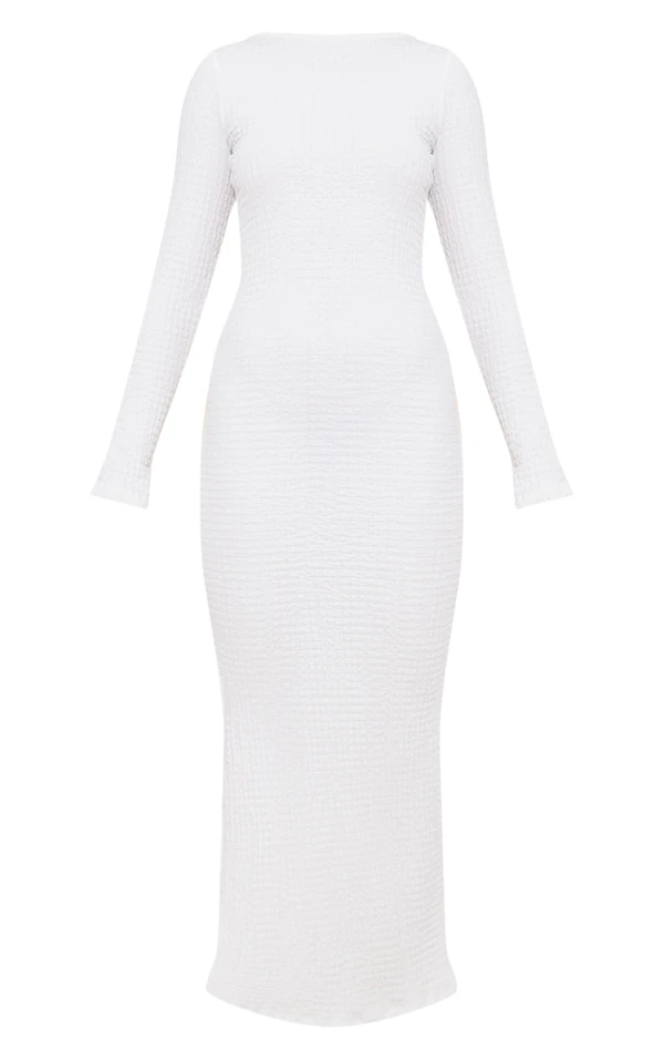 Robe mi-longue texturée blanche à manches longues et dos ouvert
