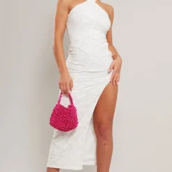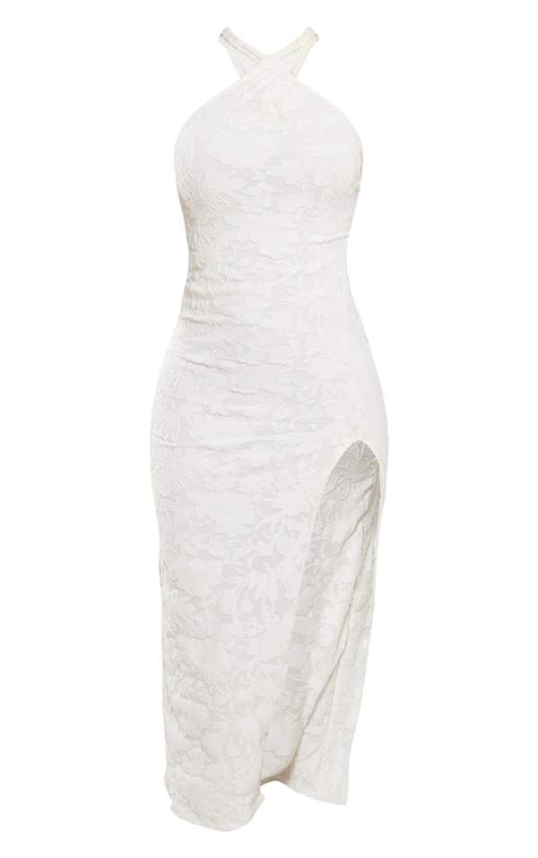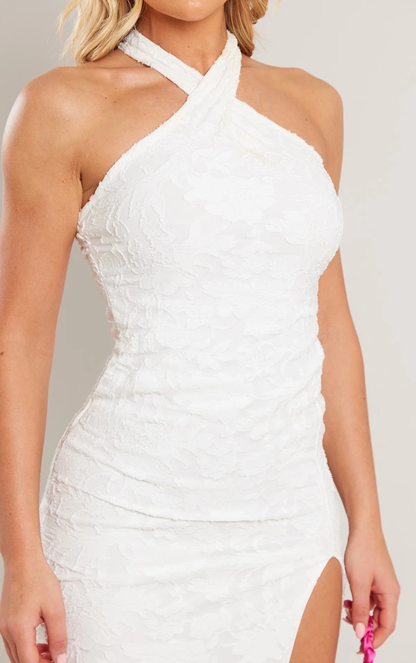Robe mi-longue texturée fleurie blanche fendue à col torsadé et dos nu