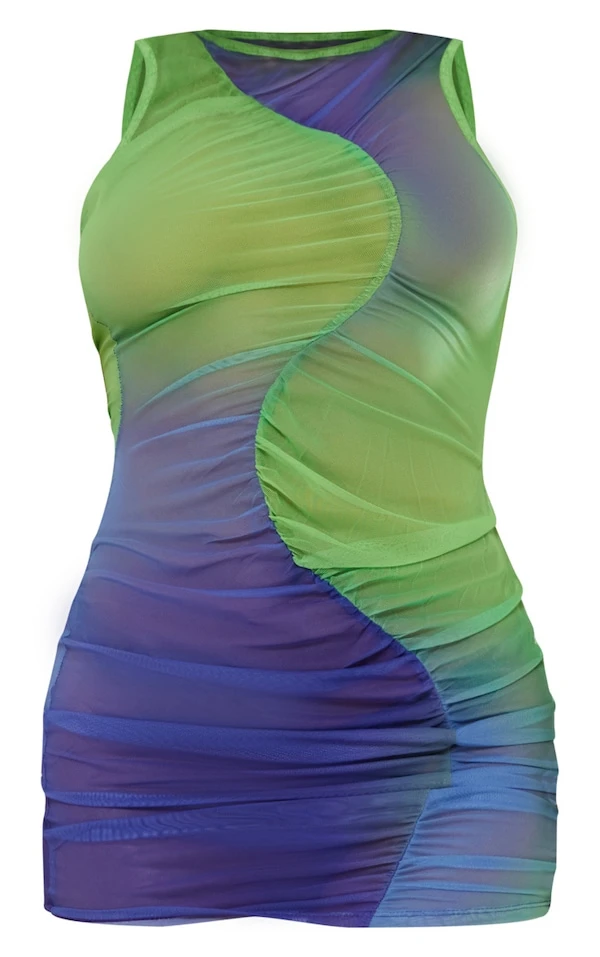 Robe moulante asymétrique en mesh violet imprimé dégradé froncée
