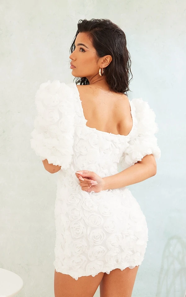Robe moulante blanche rose appliquée à col bardot et détail bonnets