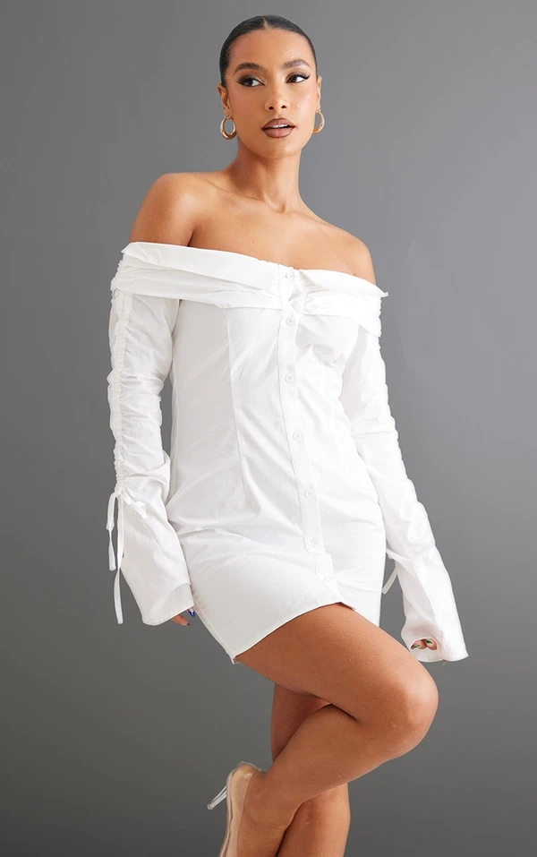 Robe moulante boutonnée blanche en maille tissée froncée à col bardot