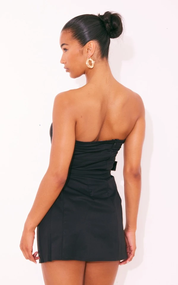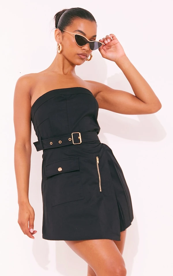 Robe moulante cargo noire plissée à ceinture nouée