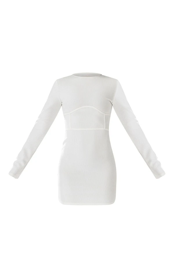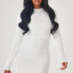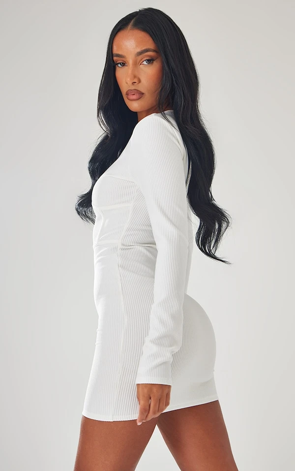 Robe moulante côtelée blanche à détails coutures et manches longues