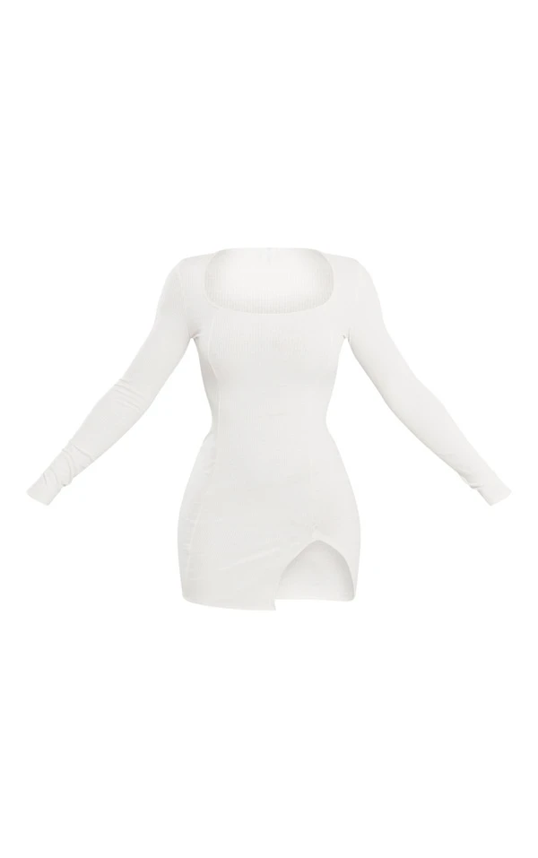 Robe moulante côtelée crème fendue à col carré et manches longues